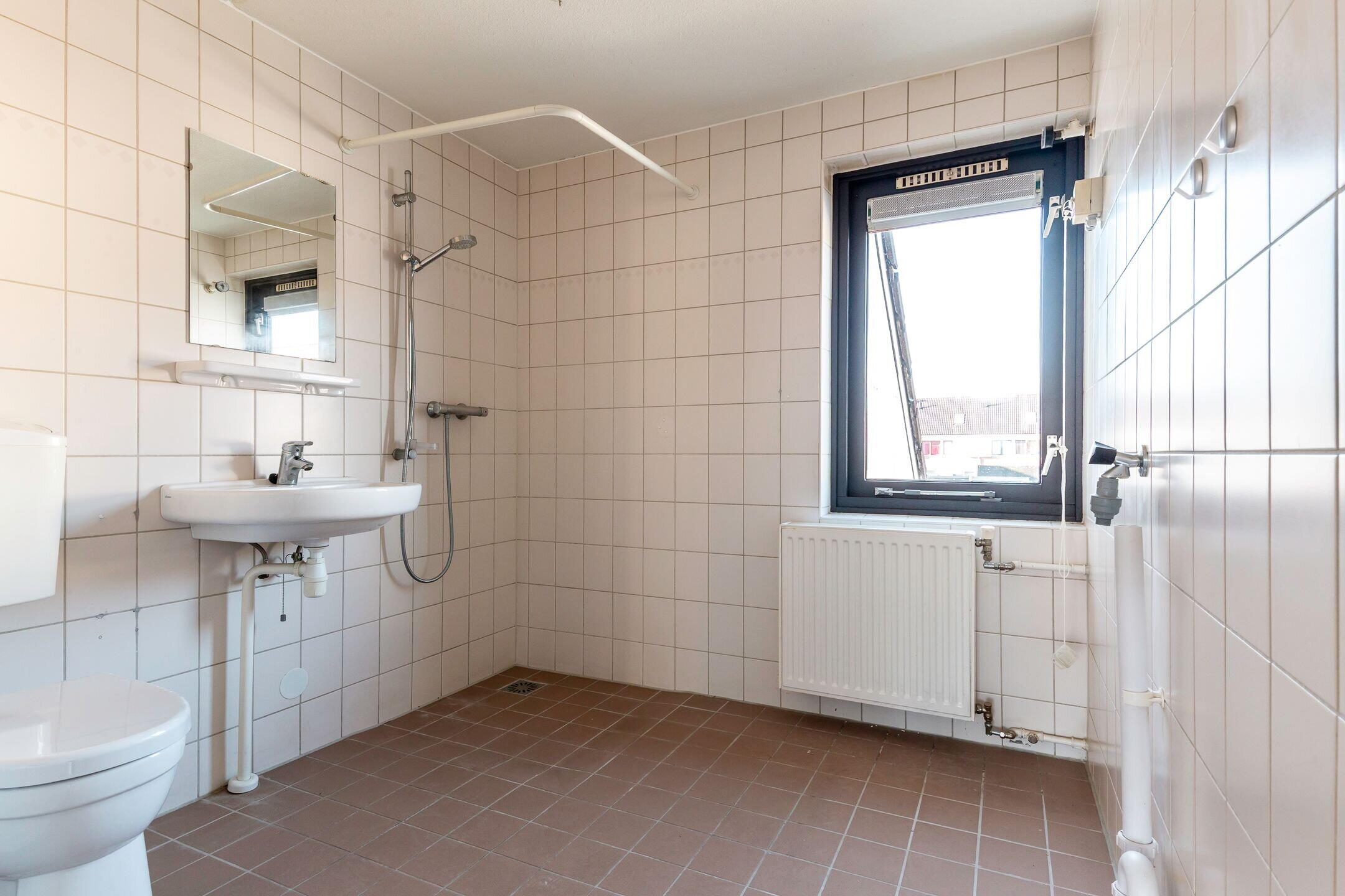 Eerste verdieping: Overloop; drie slaapkamers van respectievelijk 9,2-, 9,6- en 14,3m²; volledig betegelde badkamer welke is voorzien van een wasmachineaansluiting, een douche, tweede toilet, wastafel, een radiator en een raam voor de natuurlijke ventilatie en daglichttoetreding.