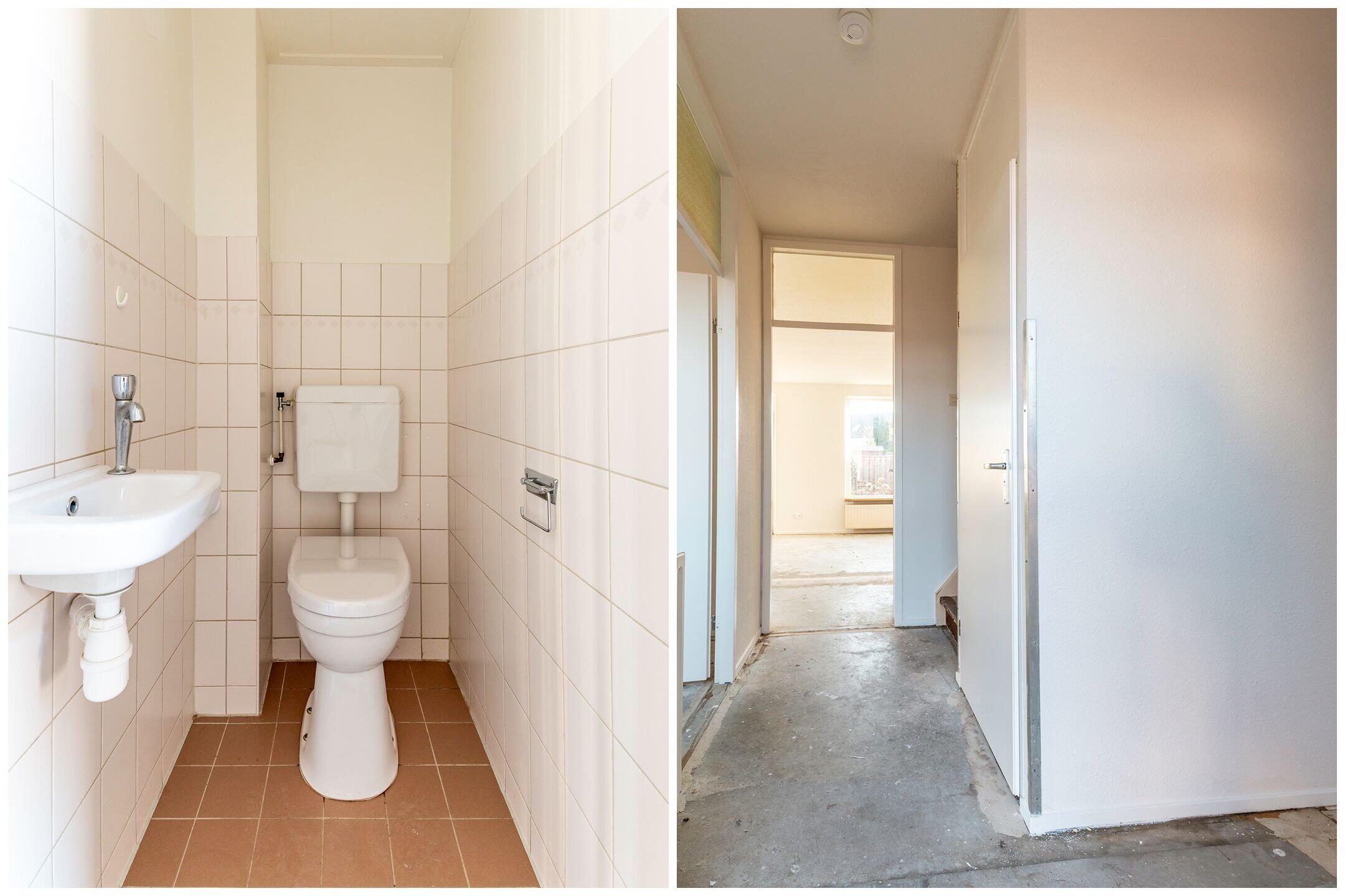 Begane grond: Entree; hal met meterkast, toilet met fonteintje, trapopgang naar de verdieping en toegang tot de woonkamer en keuken alsmede de aangebouwde stenen berging met eigen deur naar buiten; tuingerichte woonkamer van ongeveer 26m² met trapkast en toegang tot de achtertuin; afsluitbare keuken welke is voorzien van een eenvoudig keukenblok en een afzuigkap.